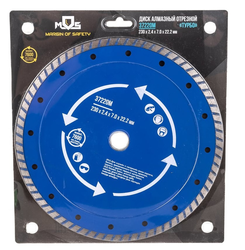 Диск отрезной алмазный MOS Турбо 37220М 230х2,4х7х22,2 мм для использования с УШМ. Посадочный диаметр 22,2 мм. Для "сухой" и "влажной"резки кирпича, бетона, мрамора,гранита и других твердых материалов.