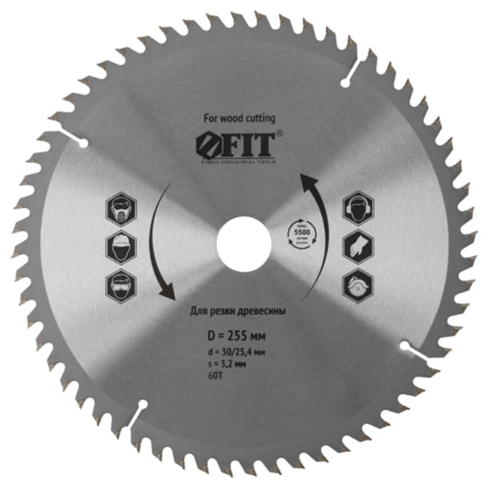 Диск пильный Fit для циркулярных пил по дереву 255х30/25,4х60T. Предназначен для выполнения продольных и поперечных резов в мягких и твердых породах дерева, фанере, а также в ДСП с покрытием.