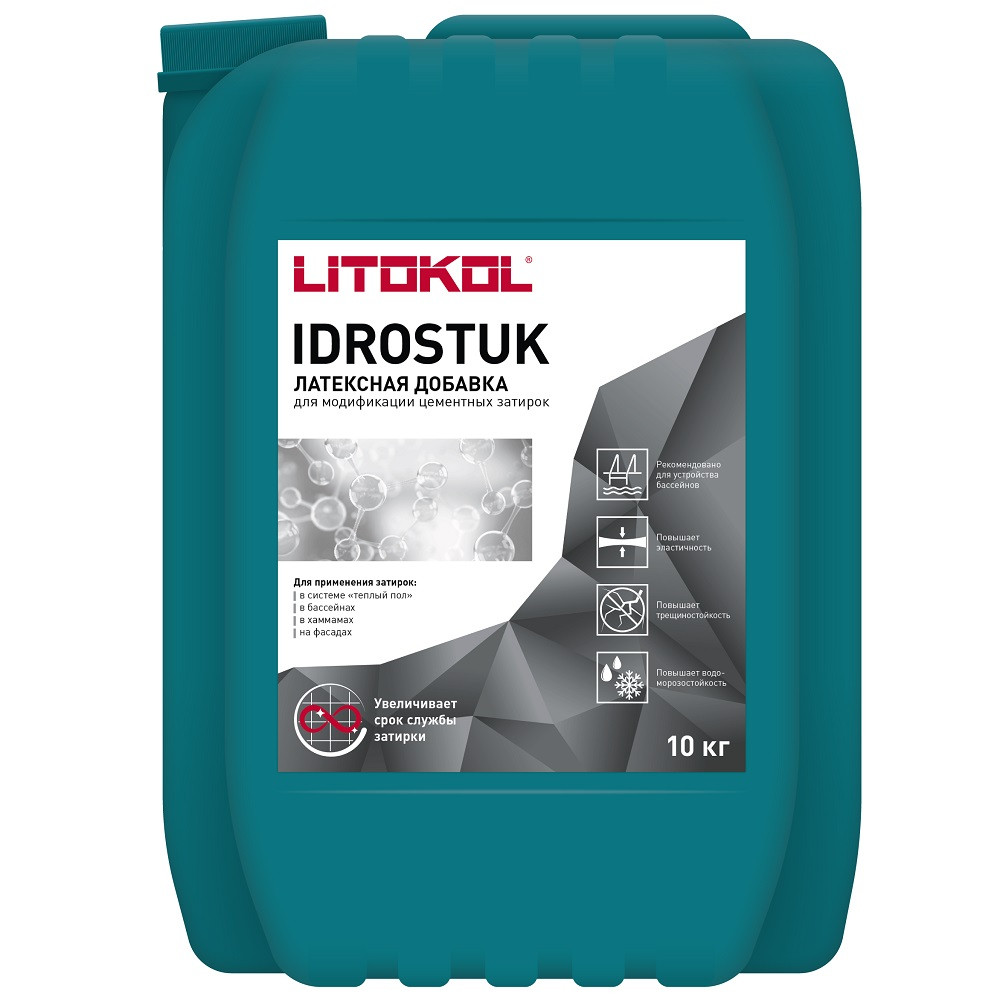 Добавка латексная для затирок Litokol Idrostuk-М 10 кг - добавка на основе водной дисперсии синтетических смол. Применяется для разведения цементных затирочных смесей (Litochrom 1-6/3-15) вместо воды.