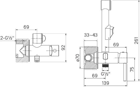Встраиваемый смеситель с гигиеническим душем Iddis Spring 003BNR0i08 со стильным сатиновым покрытием подойдет для современной ванной, привнесет в нее комфорт и эстетику. Имеет крючок для полотенца; крючок и держатель для лейки при необходимости можно поменять местами. Гигиеническая лейка и гладкий душевой шланг длиной 1,2 метра в комплекте. Диаметр лейки: 3.3 см, размер розетки: 7 см.