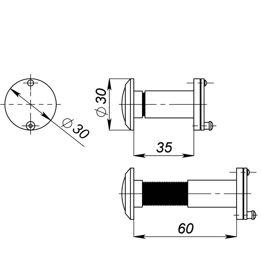 Дверной глазок Fuaro DV 1/60-35/S (Viewer 1 DVS) в хроме 3770 - предназначен для установки в двери толщиной от 35 мм до 60 мм. Глазок обладает углом обзора 180 градусов, позволяет четко видеть посторонних на расстоянии до 3 метров. Выполнен из стали, оптика из пластика, имеет черный цвет.