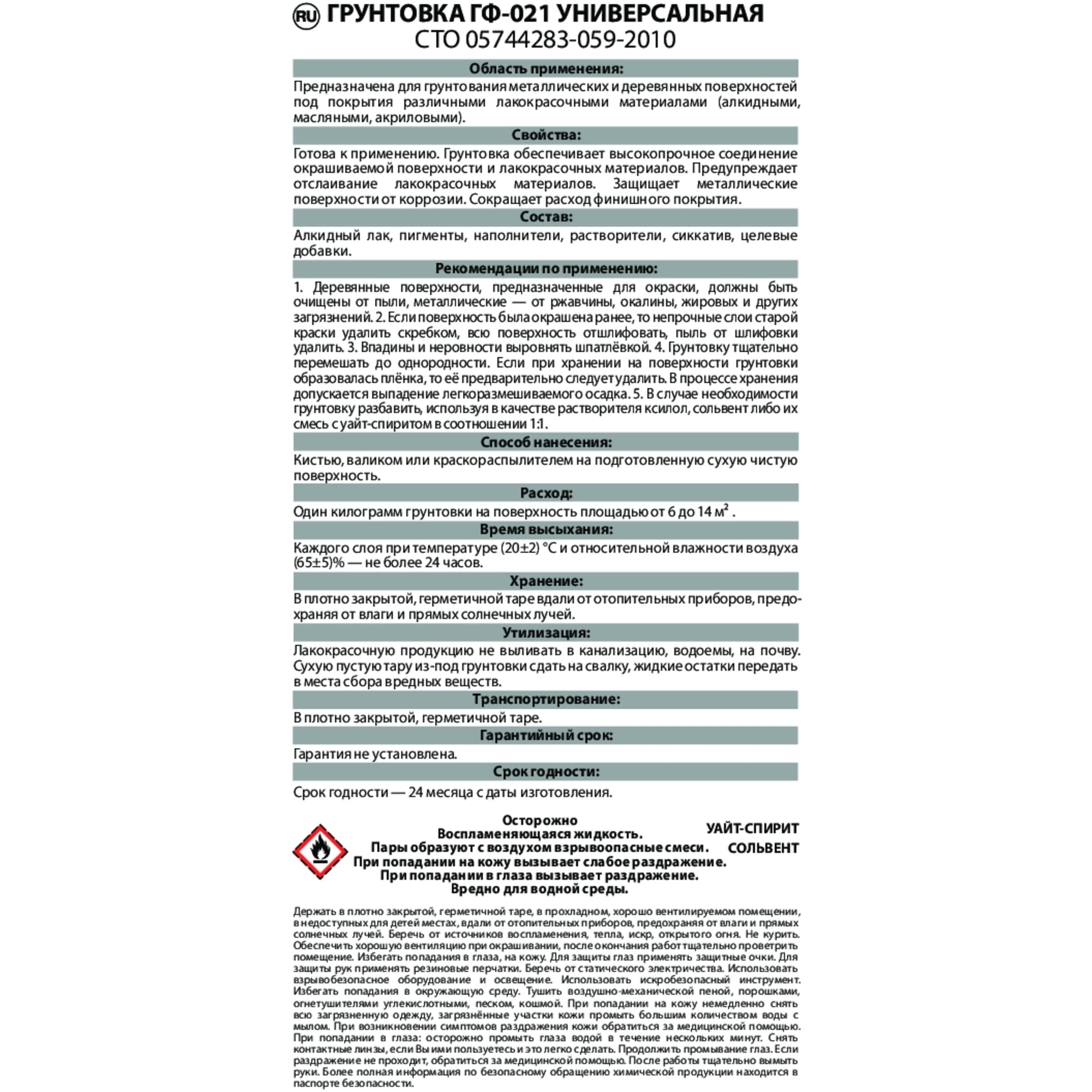 Готовая к применению грунтовка для металлических и деревянных поверхностей ГФ-021 белого цвета обеспечивает высокопрочное соединение окрашиваемой поверхности и лакокрасочных материалов. Защищает металлические поверхности от коррозии. Сокращает расход финишного покрытия. Время высыхания одного слоя - не более 24 часов. Наносят грунтовку кистью, валиком или краскораспылителем на подготовленную, сухую, чистую поверхность.