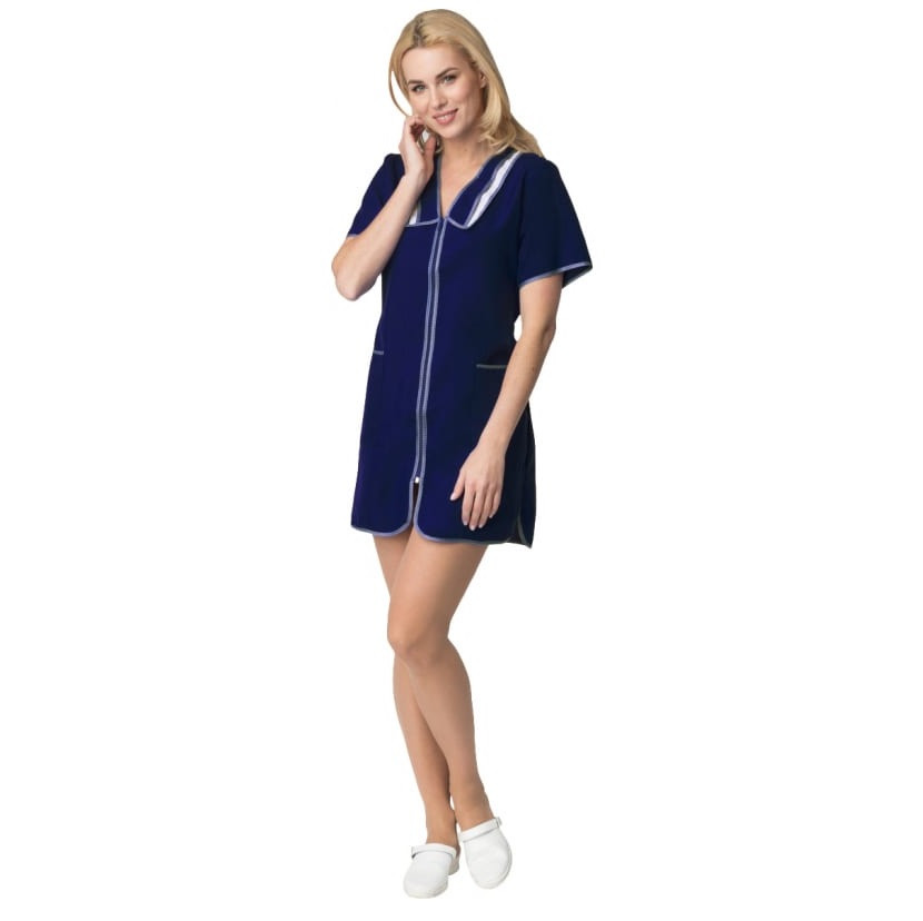 Халат женский Факел Сакура 87479769.009 темно-синий 58 представляет собой спецодежду для работников сферы услуг. Изготовлен из плотной ткани Габардин, которая обладает высокой стойкостью к изнашиванию, хорошо держит форму, не растягивается.