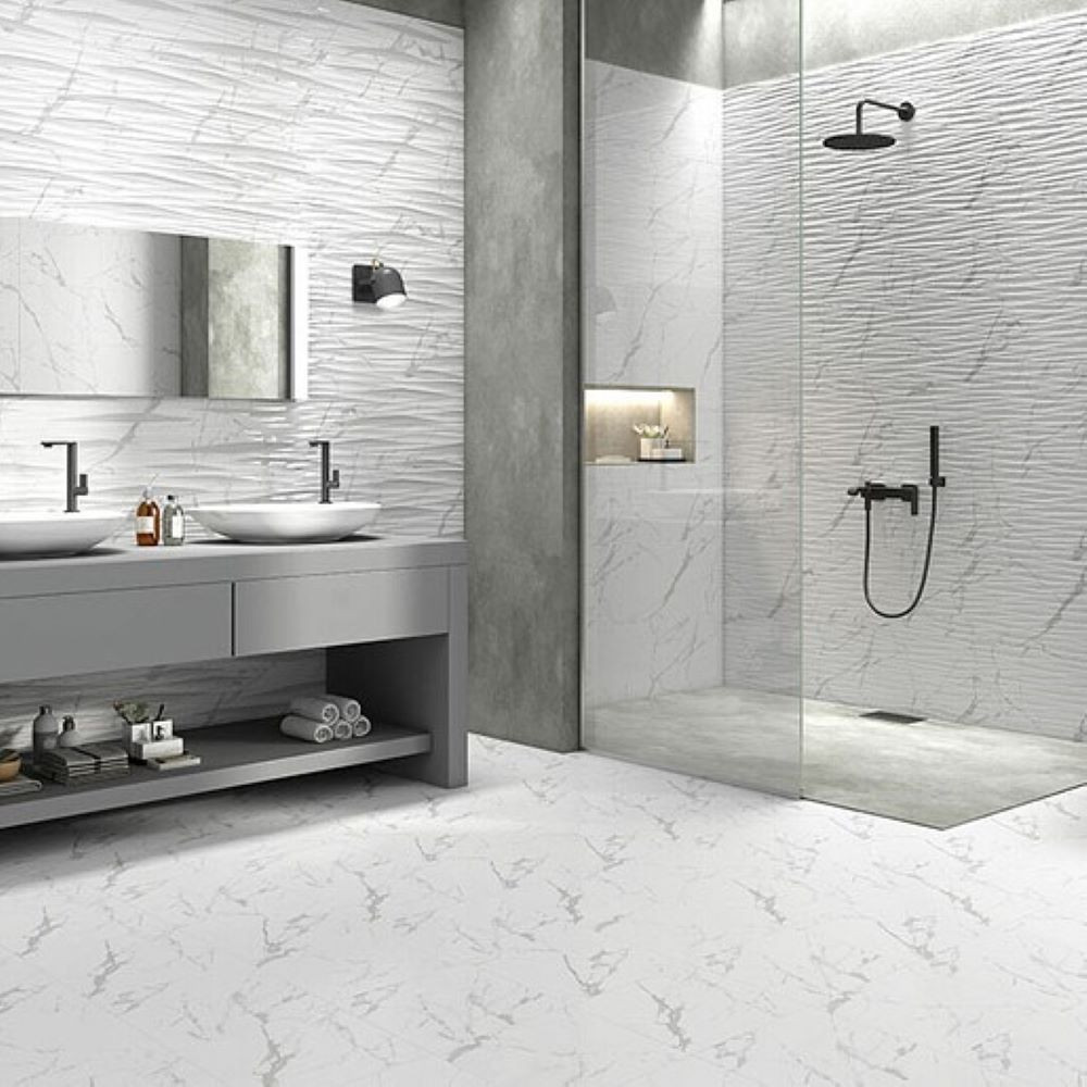 Коллекция настенной плитки для современных интерьеров предложена дизайнерами в Gravita Noble. В основе коллекции красивое сочетание мрамора с серыми прожилками и декоративной объемной фактуры в виде полосок на плитке, которая добавляет динамичности и объема помещению.
