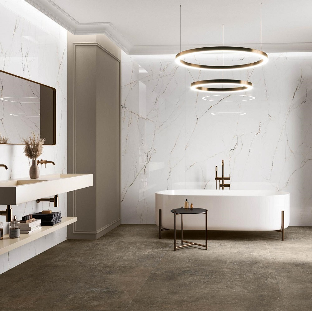 Благодаря ректифицированной обработке среза керамогранита и крупногабаритному формату ничто не отвлечет от элегантного мраморного узора. Элементы легко укладываются в безупречную бесшовную поверхность, на молочно-белом фоне которой разворачиваются сложные переплетения тончайших серы…