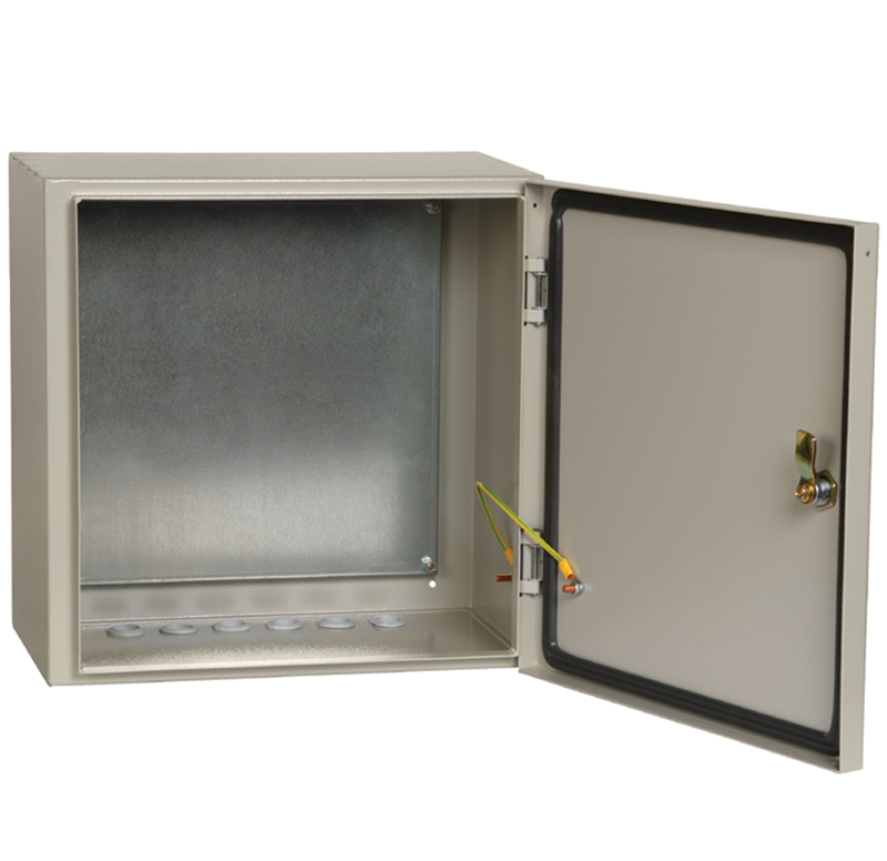 Сварной металлический корпус со съемной монтажной панелью. Дверца корпуса запирается на замок. Ключ замка имеет единый секрет. Корпуса со степенью защиты IP54 имеют на дверце уплотнение из двухкомпонентного герметика и пылевлагонепроницаемый замок.