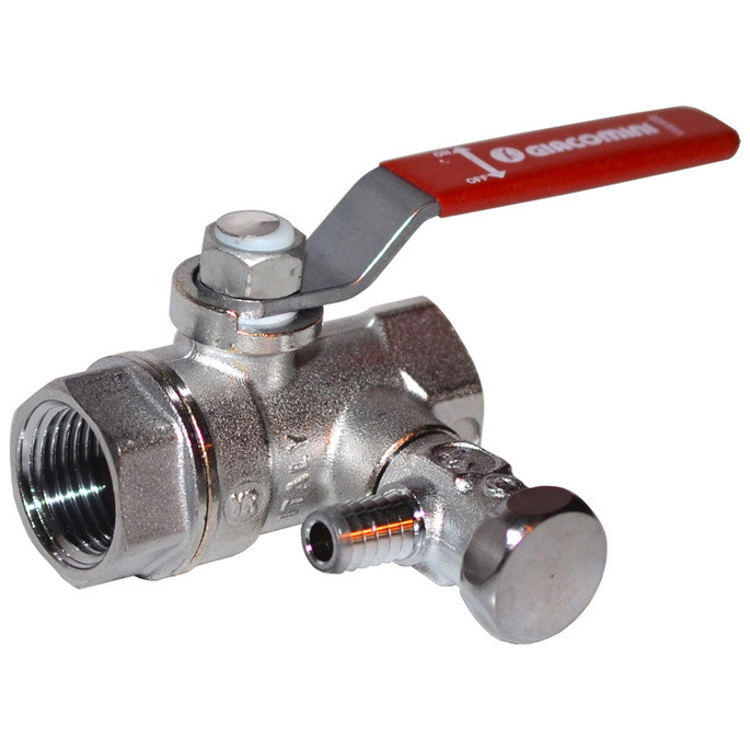 Шаровой кран Giacomini серии R250DS - со сливом, резьба внутренняя/внутренняя 2”, стандартный проход, хромированный, ручка - рычаг красный, сливной кран на 3/8”.