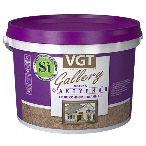 Краска фактурная VGT силиконизированная представляет собой вязкую, грубодисперсную однородную массу. После высыхания образует декоративное рельефное покрытие глубиной до 3 мм, скрывающее мелкие дефекты стен. Отличается высокой твёрдостью, атмосферостойкостью, образует «дышащее» покрытие. Обладает гидрофобными (водоотталкивающими) свойствами.
