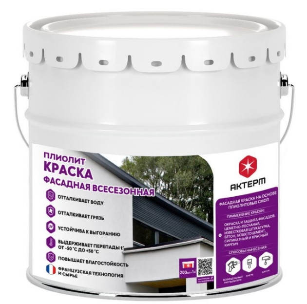 Актерм Плиолит - фасадная плиолитовая дышащая краска для наружных работ. Изготовлена на основе термопластиковых плиолитовых смол (акриловых сополимеров) в качестве связующего.