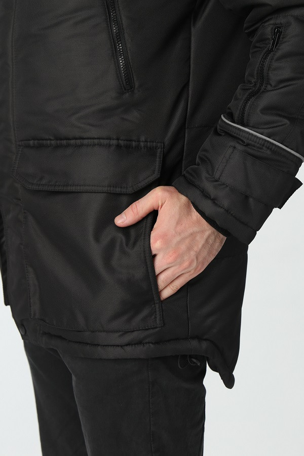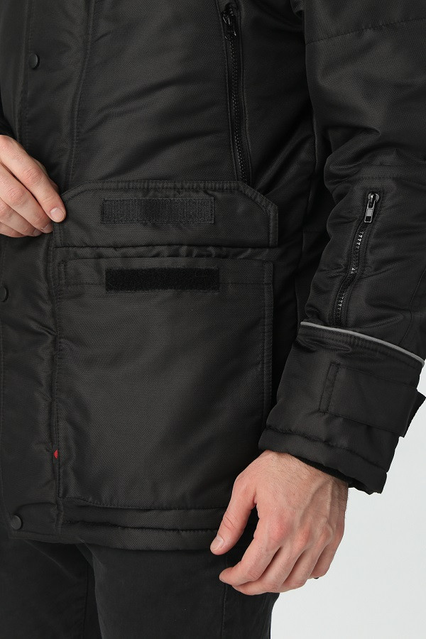 Куртка зимняя мужская Факел Аляска-Люкс черного цвета - это комфортная и удобная одежда, которая предназначена для сотрудников, работающих в холодную погоду на улице, например для работников сервисных служб, сторожей, дежурных на объектах и т.д. Данная модель разработана для работы в неблагоприятных условиях и обеспечивает тепло и уют при температуре до -20 С.