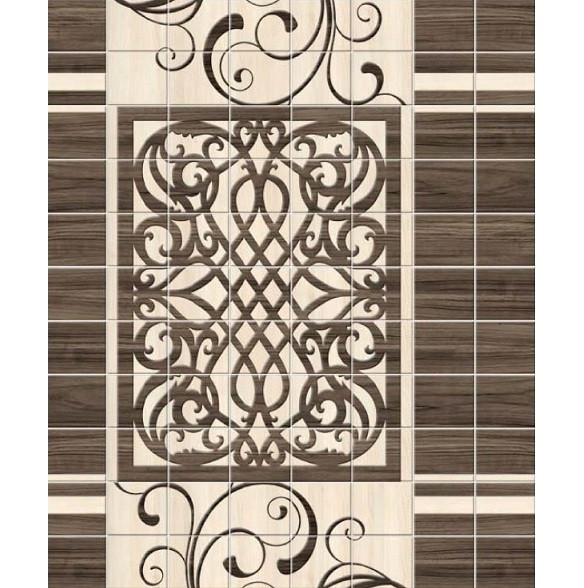 Ламинат SPC Novita 3D Грация 1 имитирует кафельную плитку в бежево-коричневой гамме. Основной рисунок с вензелями и завитушками внутри имеет форму прямоугольника.