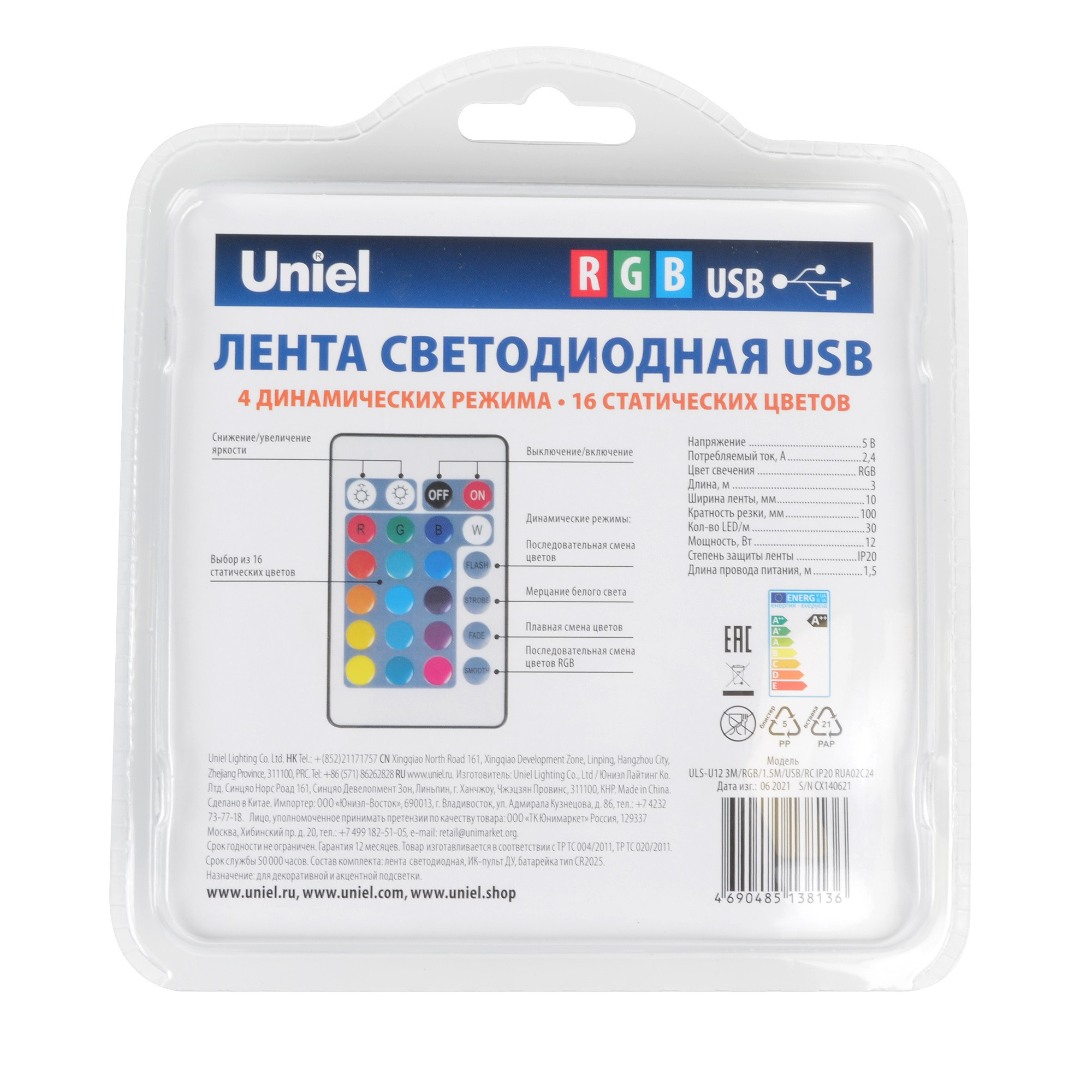 - Лента светодиодная Uniel ULS-U12 RGB с пультом ДУ 30 шт/м 3 м