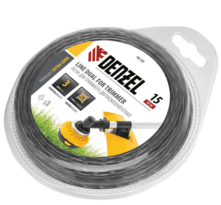Леска для триммера Denzel Extra Cord заправляется в мощные бензиновые косы от 1,5 кВт. Она имеет Двухкомпонентную структуру, сечение «квадрат» и ширину 3 мм, это обеспечивает эффективное скашивание любой травы, сухостоя, бурьяна, небольших стеблей даже на сложных участках.