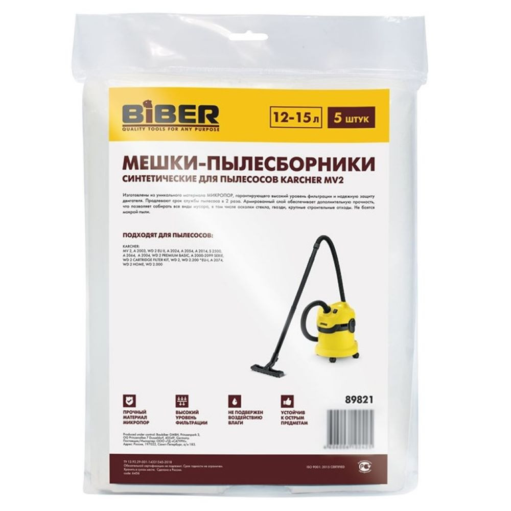 Мешки для пылесосов Karcher MV2 от производителя Biber 89821 обладают большой механической прочностью, по сравнению с бумажными пылесборниками. Данные мешки не теряют фильтрующих качеств даже при работе с влажным мусором. Тип уборки сухая/влажная.