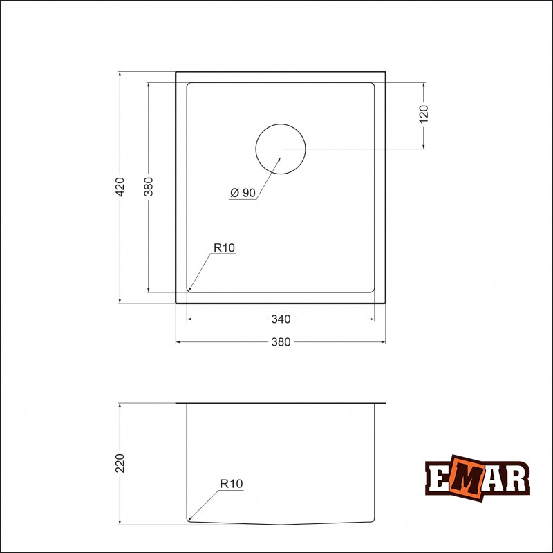 Emar EMB-130 с покрытием PVD - мойка с одной чашей, имеет радиус закругления с внешней и внутренней стороны. Изготовлена из нержавеющей стали с толщиной 1 мм, размер слива — 114 мм. Мойка сварная, универсального монтажа имеет одну чашу, для модуля 500 мм. Смеситель для мойки устанавливается на столешницу. С нижней стороны и по бокам есть шумопоглощающие накладки. Вырез под мойку - по шаблону.