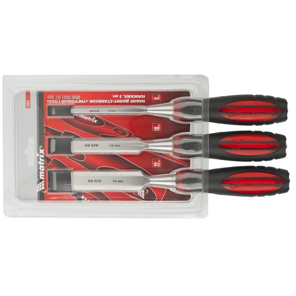 Набор плоских долот-стамесок Matrix «Тигровый глаз» 24431, 3 штуки, 8-16-22 мм, используется при обработке древесины любых пород. Стамески позволяют выбирать пазы, проделывать выемки, снимать фаски, выдалбливать отверстия разной ширины. Ударопрочный пластик рукояток и металлический затыльник позволяют применять киянку или молоток для легкого врезания в древесину любой твердости. Набор пригодится столярам, плотникам и мебельным мастерам.