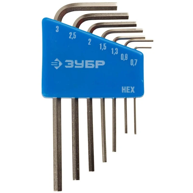 Набор ключей имбусовых Зубр Эксперт Мини для точных работ Cr-V HEX 0,7 0,9 1,3 1,5 2 2,5 3 мм 7 шт. - изогнутые двусторонние ключи различных размеров, предназначенные для работы с винтами, имеющими внутренний профиль в форме шестигранника.