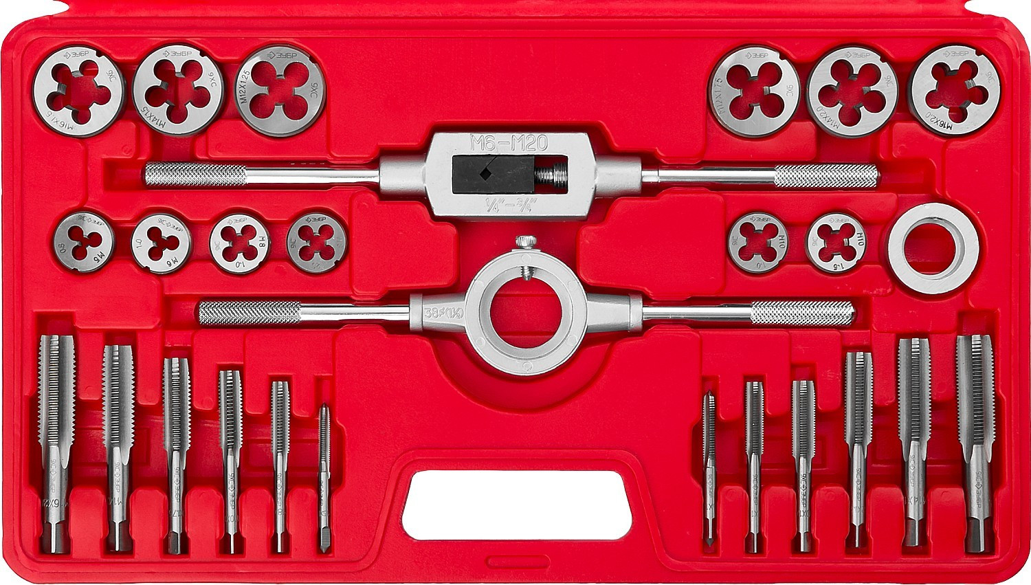 Набор метчиков и плашек Зубр Мастер предназначен для нарезания внутренней метрической резьбы с нормальным и мелким шагом, трубной резьбы в сквозных и глухих отверстиях, а также внешней резьбы на изделиях из стали и цветных металлов.