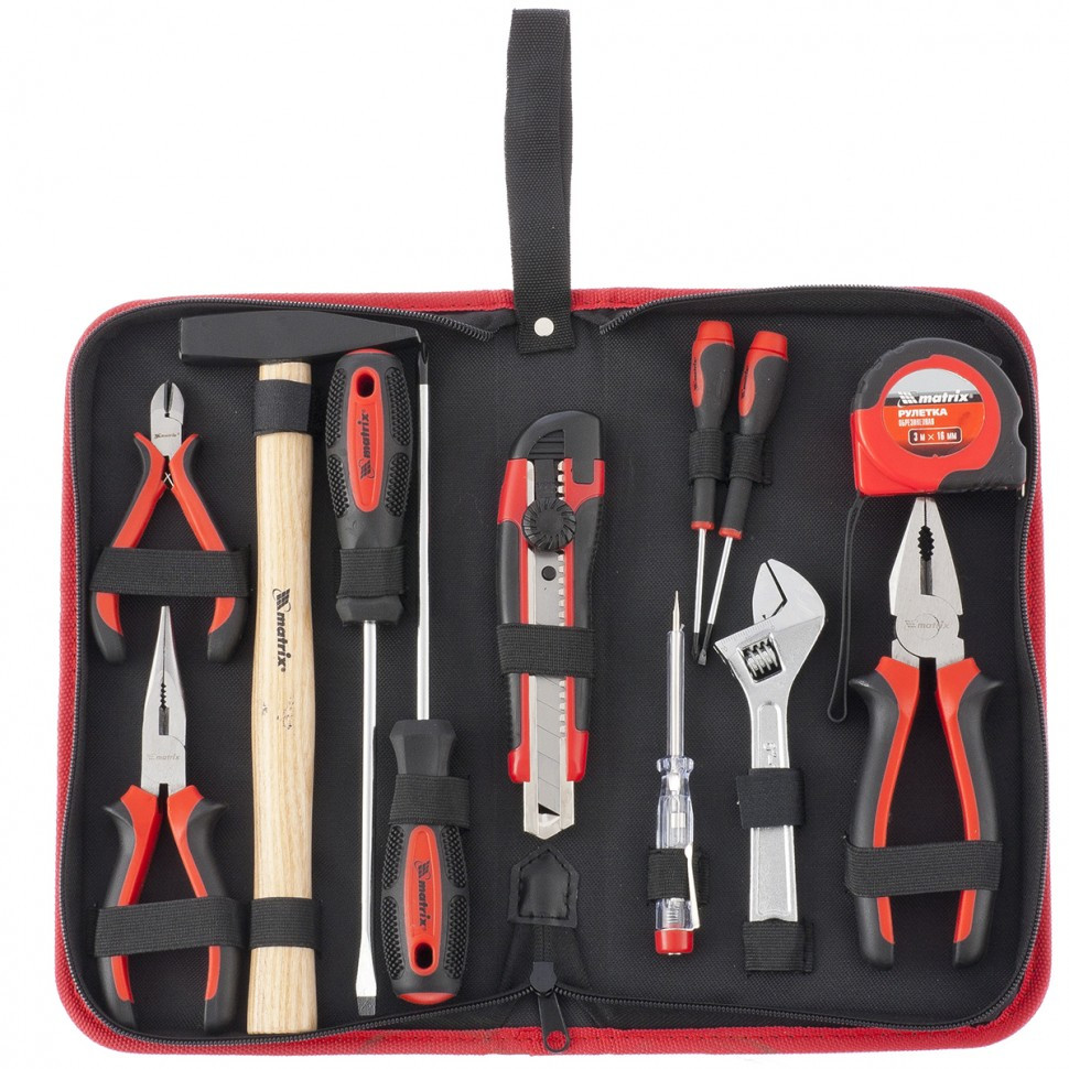 Набор Matrix 13562, 12 предметов, будет полезен как частным мастерам, так и профессионалам для проведения слесарно-монтажных работ. Он включает отвертки для монтажа/демонтажа резьбовых соединений, в том числе и мелких, разводной ключ для болтов и гаек, нож для резки плотных материалов, рулетку для проведения замеров, молоток, кусачки, и тестер напряжения.