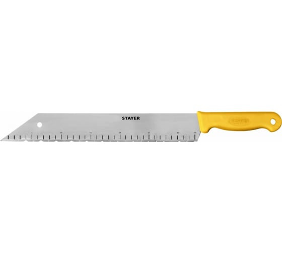 Нож для изоляционных материалов Stayer 09592, применяется для резки твердой пены, минеральной ваты и пенопласта. Лезвие ножа из нержавеющей стали. Зубчатая заточка лезвия. Длина лезвия позволяет быстро и ровно разрезать толстый слой теплоизоляции. Эргономичная пластиковая рукоятка.