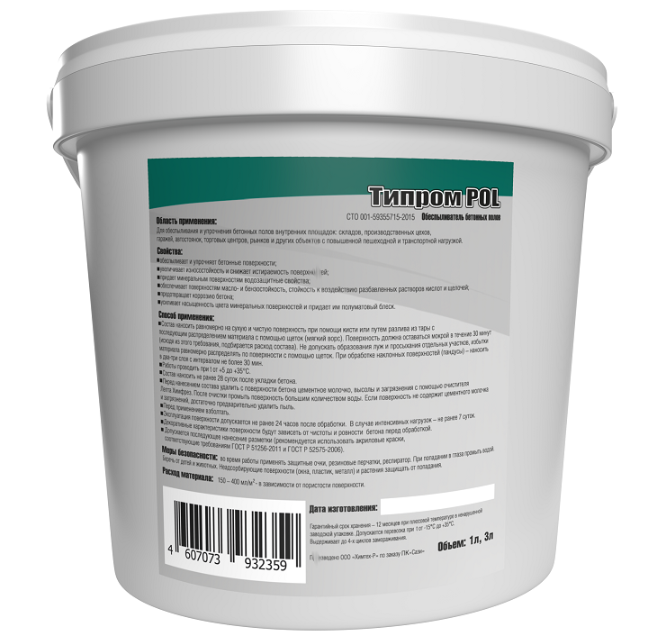 Обеспыливатель бетонных поверхностей Типром Pol - готовый к применению состав, представляющий собой композицию на основе акриловых сополимеров и модифицирующих добавок.