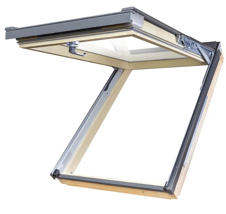 Окно мансардное Fakro FPP-V Max U3 550х980 мм - самая популярная конструкция окна для крыши. Благодаря фрикционным петлям, располагающимся в ее центральной части, створку можно оставлять в позиции наклона, а также поворачивать вокруг оси на 180°, что значительно облегчает мытье внешнего стекла.