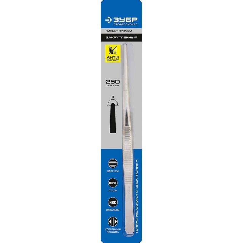 Пинцет Зубр Профессионал 22211-1-250- это профессиональный инструмент длинной 250 мм для работ с электроникой и точной механикой.Антимагнитный пинцет удобен для удержания микроэлементов при пайке.Нержавеющая сталь в течение длительного времени сохраняет аккуратный внешний вид инструмента.Тип губок: прямой закругленный.