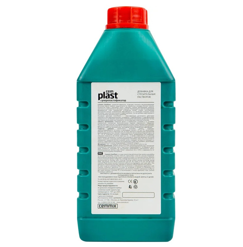 Пластификатор Cemmix CemPlast 1 л суперпластифицирующая и суперводоредуцирующая добавка для бетонов. Суперпластификатор, позволяет получить высокоподвижные бетонные смеси, снизить трудозатраты на обработку и кладку бетона, снижает количество воды в бетонной смеси, повышает степень реагирования цемента, прочность и долговечность бетонных изделий.