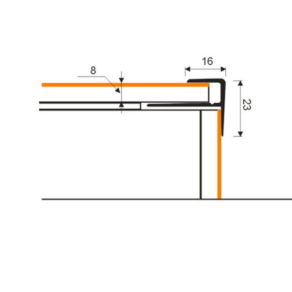 F-образная угловая планка со скрытым креплением Myck D-K0600 выполнена из жесткого ПВХ, ламинированного высокопрочным шпоном. Ширина "плечиков" составляет 16 мм и 23 мм, глубина монтажа - 8 мм (при установке следует учитывать любые другие монтажные материалы, такие как подложки или адгезивы).