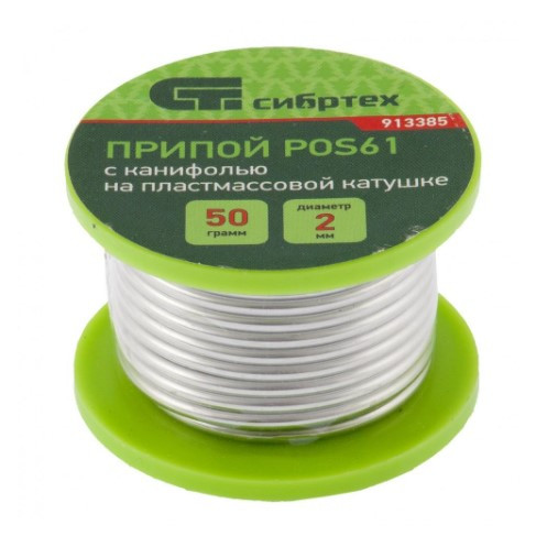 Припой с канифолью Сибртех ПОС61 ПОС61 913385 D 2 мм 50 г предназначен для пайки электронных схем, электрических изделий и электропроводки.