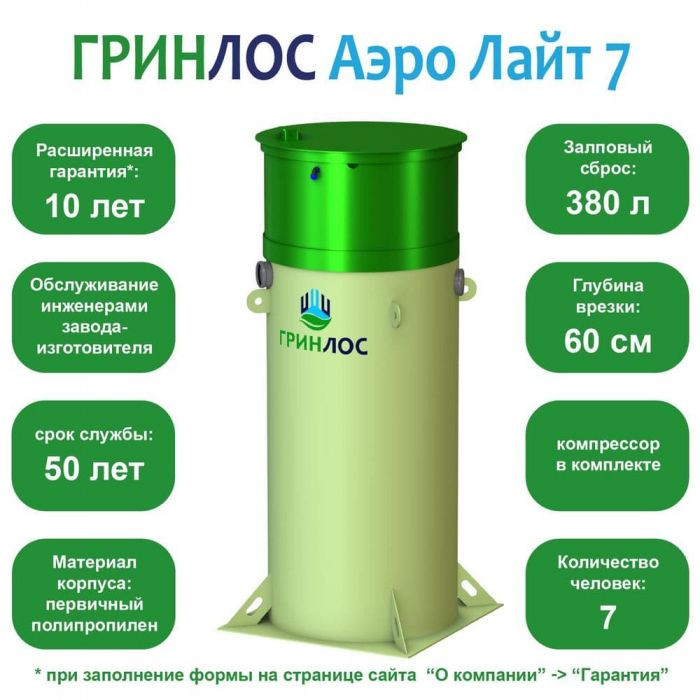 Септик Гринлос Аэро Лайт 7 1470 это самотечная модель аэрационной установки биологической переработки с залповым сбросом. Тип сброса — самотечный. Это значит, что очищенная вода сливается по трубе, которая идет под наклоном в сторону точки сброса. Применить это решение можно при наличии дренажного колодца, глубокого оврага, поля фильтрации, где вода уходит в грунт и не застаиваться. Станция подходит для монтажа во все виды почв: песок, глина, суглинок, грунты с высоким ур…