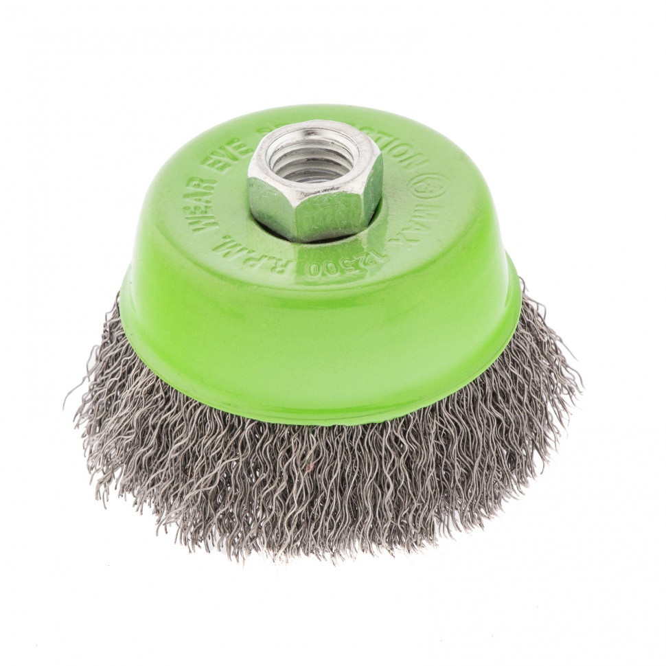 - витая или гофрированная имеет волнообразное строение проволоки и придает щетке пружинящий эффект. Это смягчает воздействие на обрабатываемую поверхность;