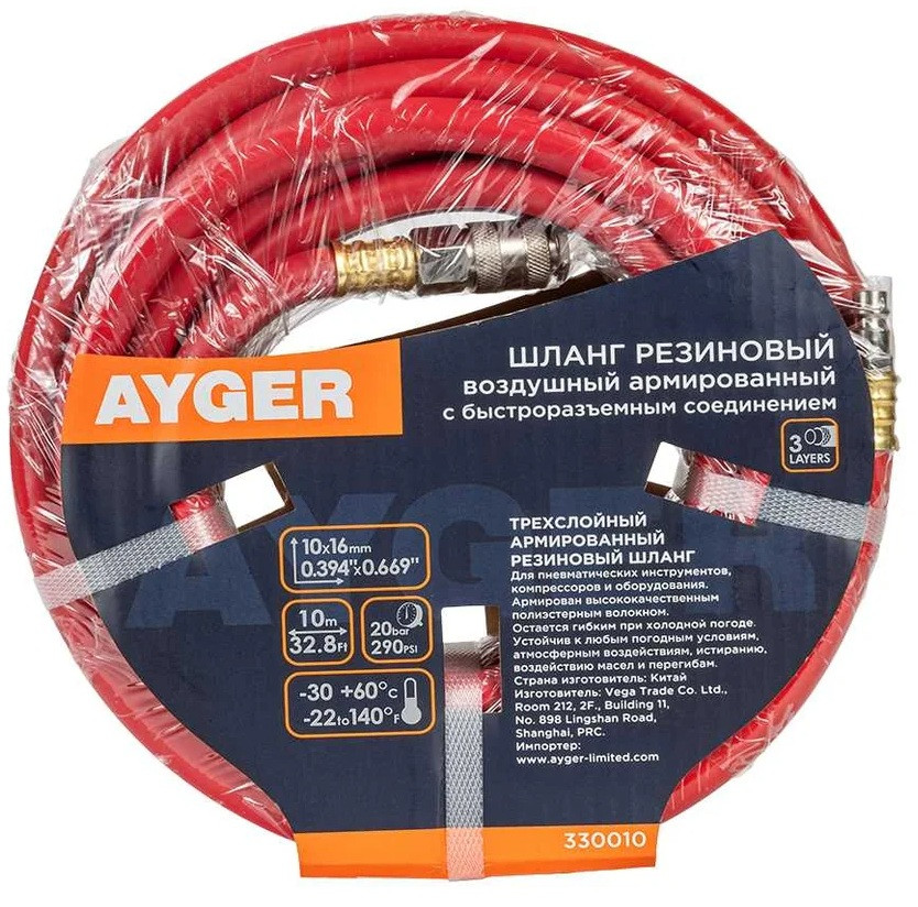 - Шланг резиновый воздушный Ayger 330010 с быстроразъемным соединением 10000х10х16 мм
