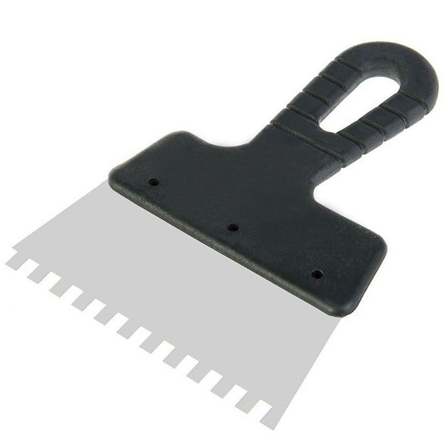 - Зубчатый шпатель имеет ряд зубцов по краю рабочего полотна для равномерного распределения наносимой массы;