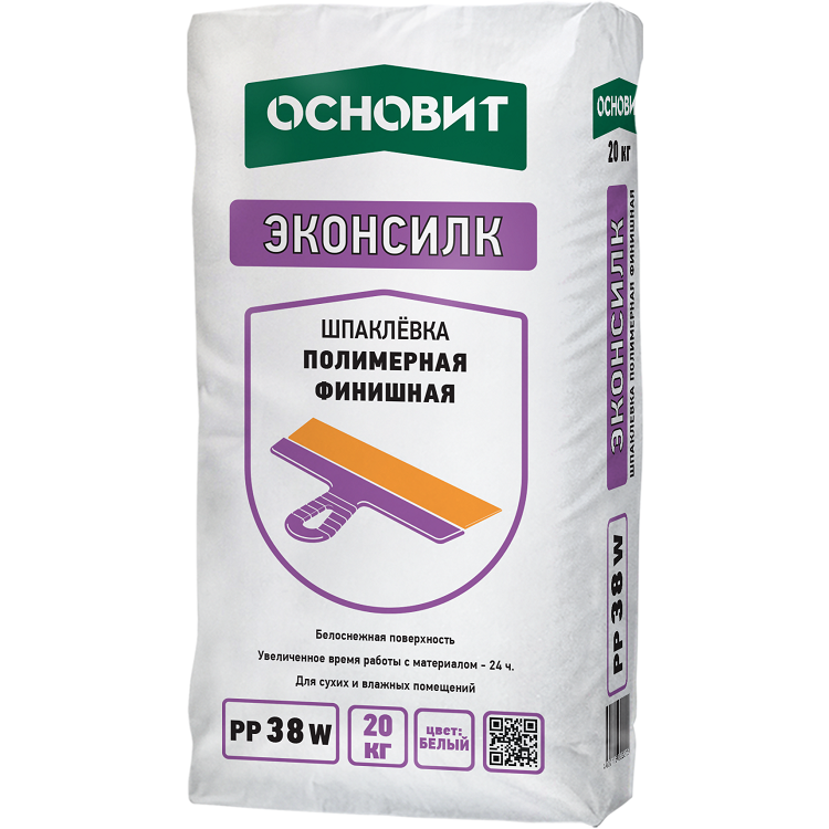 Шпатлёвка финишная полимерная Основит Эконсилк PP38 W служит для выравнивания стен и потолков в сухих и влажных помещениях. Применяется для заделки трещин, выбоин и других дефектов поверхности, для заделки швов и стыков ГКЛ, ГВЛ. Изготовлена на основе полимерного вяжущего, белого мрамора и специальных добавок. Полимерная шпатлевка Т-38 рекомендуется под последующее нанесение декоративных покрытий.