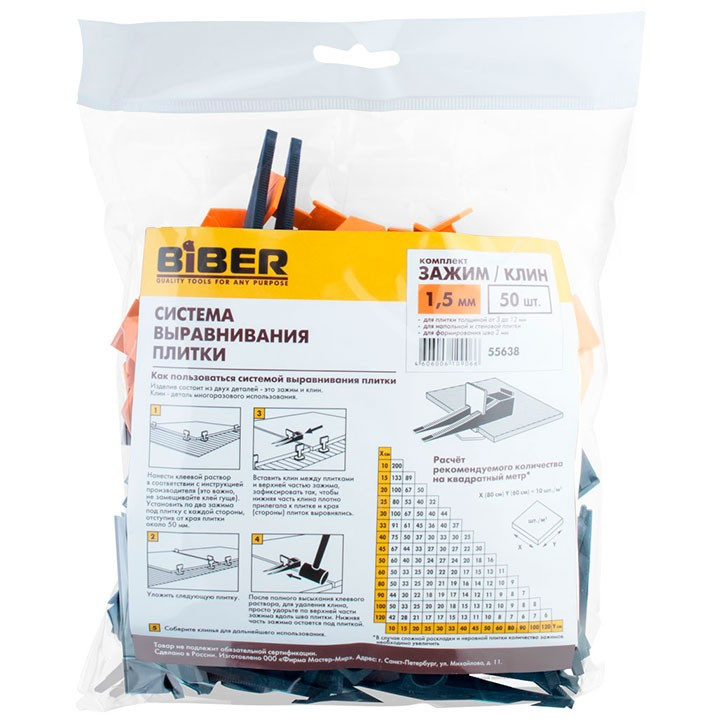 Система выравнивания плитки Biber 55638 зажим и клин 1,5 мм 50 штук