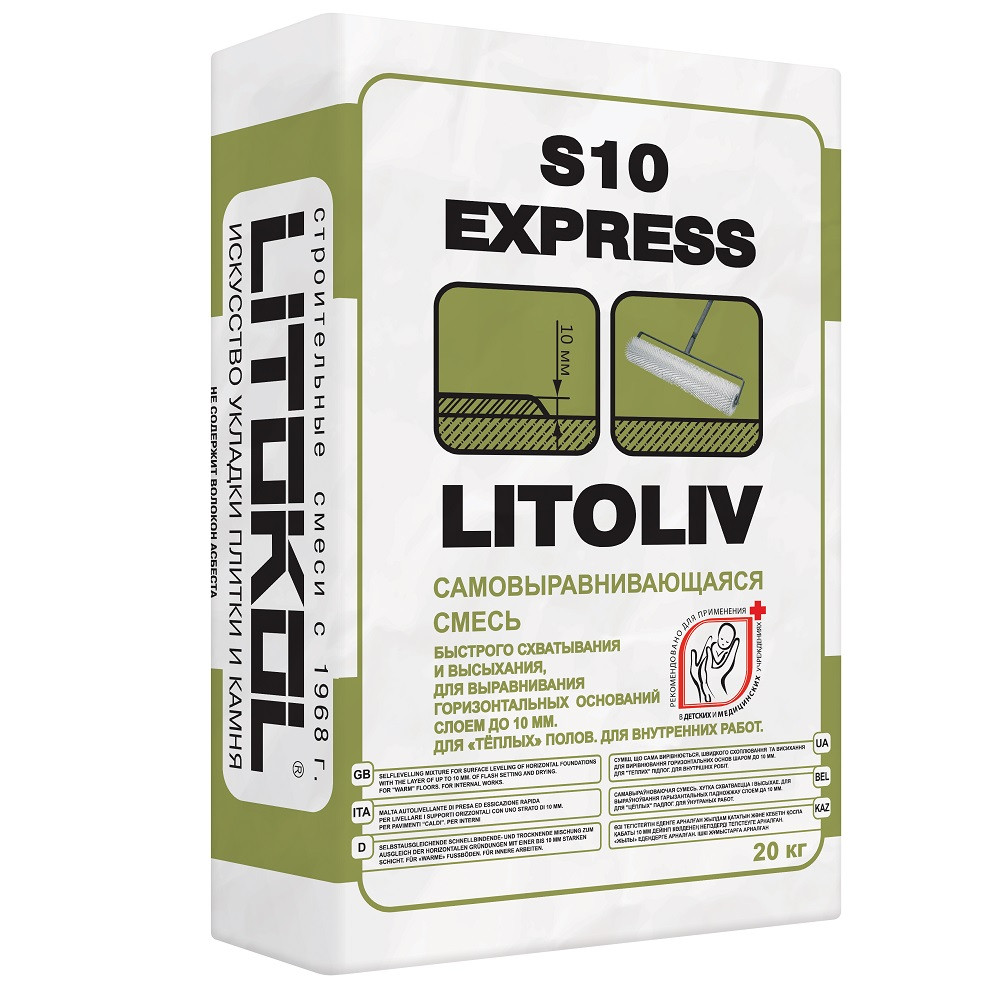 Cамовыравнивающаяся смесь Litokol LitoLiv S10 Express представляет собой сухую смесь на основе сложного вяжущего, инертных минеральных наполнителей отборной фракции и модифицирующих добавок. После затворения водой образует текучую однородную массу, самовыравнивающуюся на горизонтальной поверхности. Толщина слоя от 1 до 10 мм.