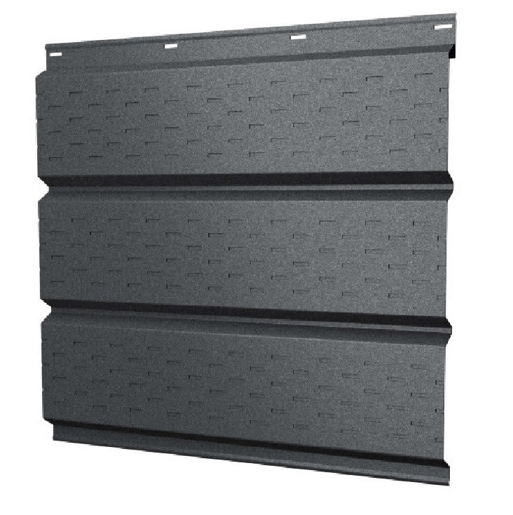 Софит Aquasystem Rooftop Бархат RAL 7024 с полной перфорацией 2400х303 мм стальной предназначен для подшивки карнизного и фронтонного свесов. Является и декоративным элементом, поскольку скрывает нижнюю часть подкровельного пространства и придает ей аккуратный и законченный вид.
