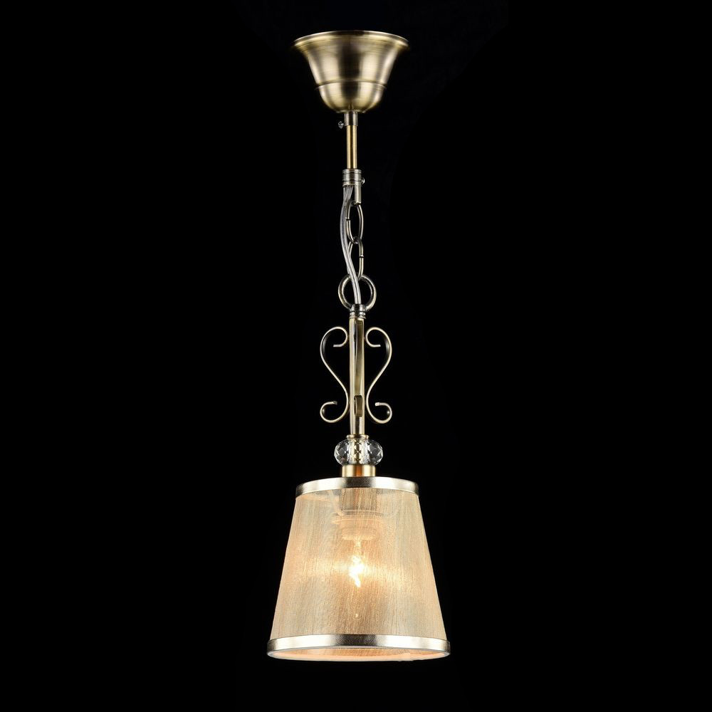 Подвесной светильник Driana FR405-11-R оформлен в стиле арт-деко и легко сочетается с другими элементами обстановки. Симпатичный тканевый плафон бежевого цвета прекрасно смотрится с бронзовой металлической арматурой. Абажур выполнен из органз…