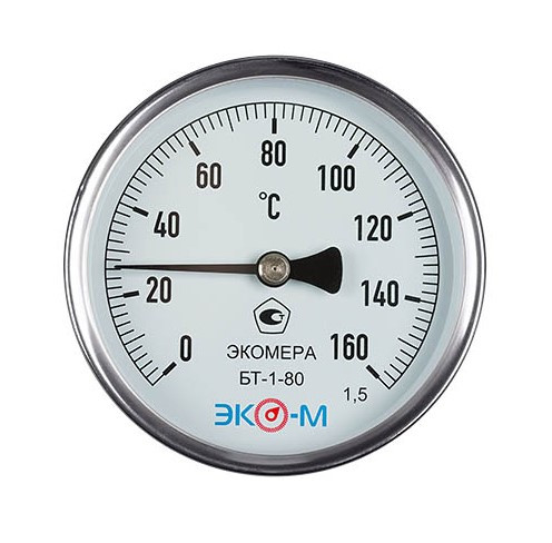 - Термометр биметаллический осевой Экомера БТ-1-63 Дк 63 L40 мм 160 C 1/2 дюйма