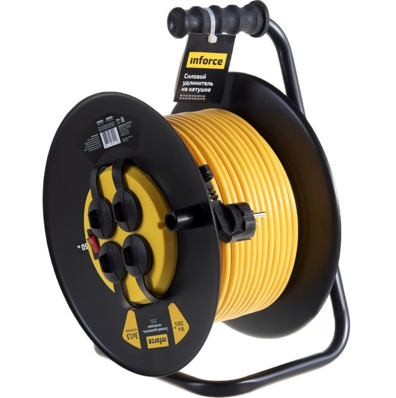 - Удлинитель силовой Inforce 09-15-06 4 розетки с заземлением ПВС 3х1,5 мм на металлической катушке 50 м