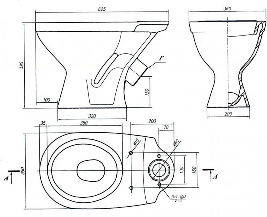 - вертикальное - патрубок направлен вертикально вниз, в пол. Присоединение производится параллельно стене;