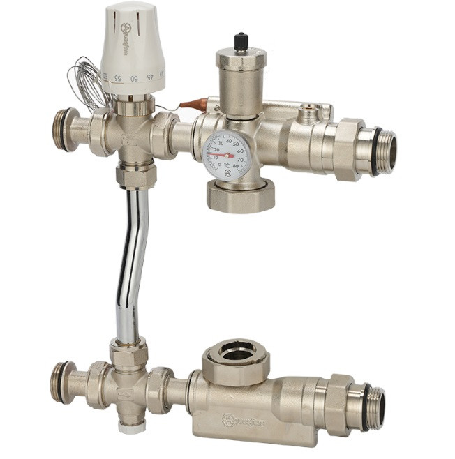 Узел насосно-смесительный Aquasfera 9510-02 1 дюйм 130 мм применяется для поддержания постоянной температуры в системах тёплого пола. Температура поддерживается на заданном уровне с помощью термостатической головки, регулирующей количество подаваемого теплоносителя. Смеситель состоит из термостатического и балансировочного клапана.