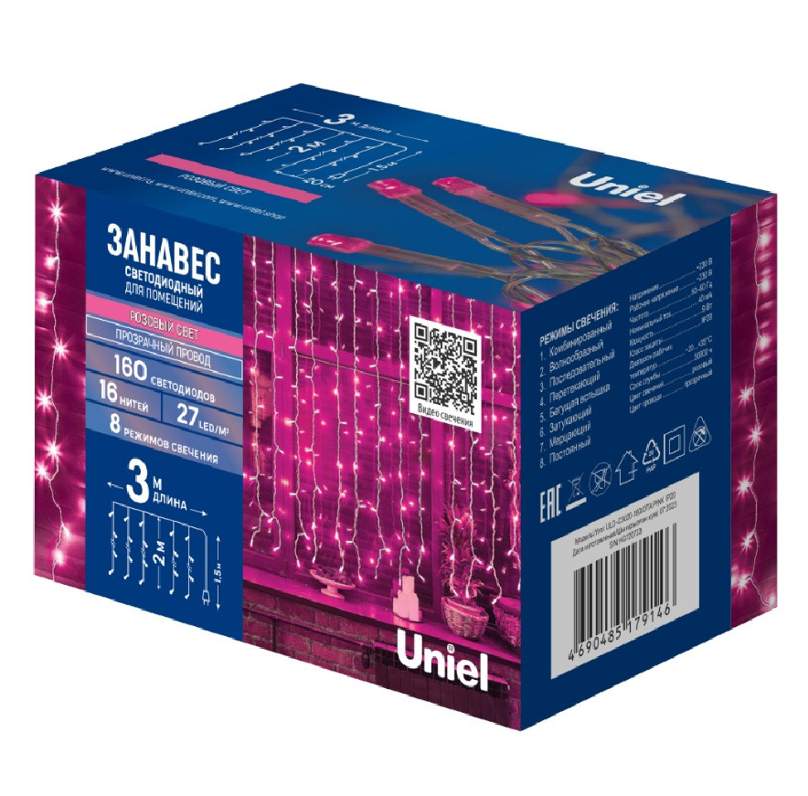 Занавес светодиодный Uniel ULD-C3020-160/DTA Pink IP20 3х2 м 160 светодиодов предназначен для декоративной подсветки, праздничного оформления в помещении и наружного дизайна.