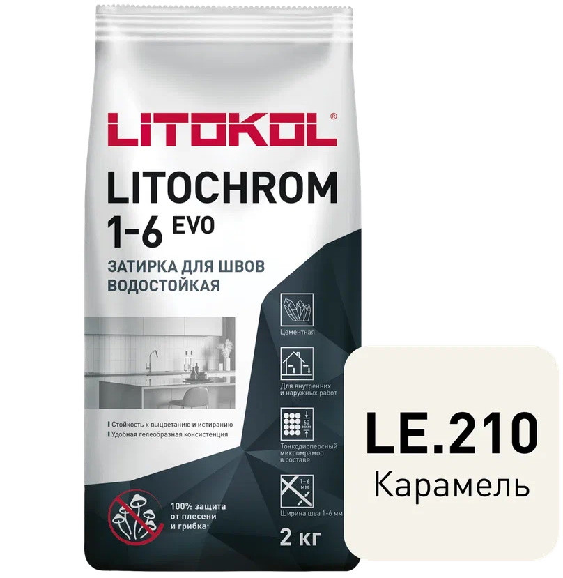 Затирка цементная для швов Litokol Litochrom 1-6 Evo - цементная затирка для заполнения межплиточных швов шириной от 1 до 6 мм с противогрибковыми свойствами. Подходит для внутренних и наружных работ.
