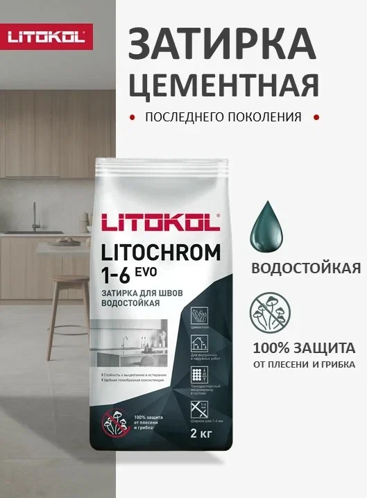 Затирка цементная для швов Litokol Litochrom 1-6 Evo - цементная затирка для заполнения межплиточных швов шириной от 1 до 6 мм с противогрибковыми свойствами. Подходит для внутренних и наружных работ.